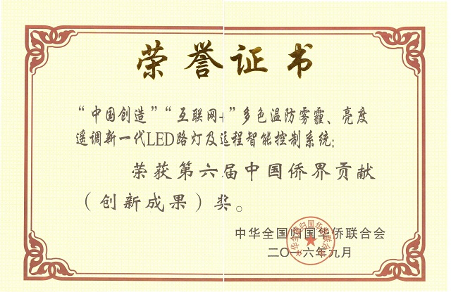 我司研發(fā)制造的“中國創(chuàng)造”“互聯(lián)網(wǎng)+”多色溫防霧霾、亮度遙調新一代LED路燈及遠程智能控制系統(tǒng)于2016年9月榮獲第六屆中國僑界貢獻(創(chuàng)新成果)獎。