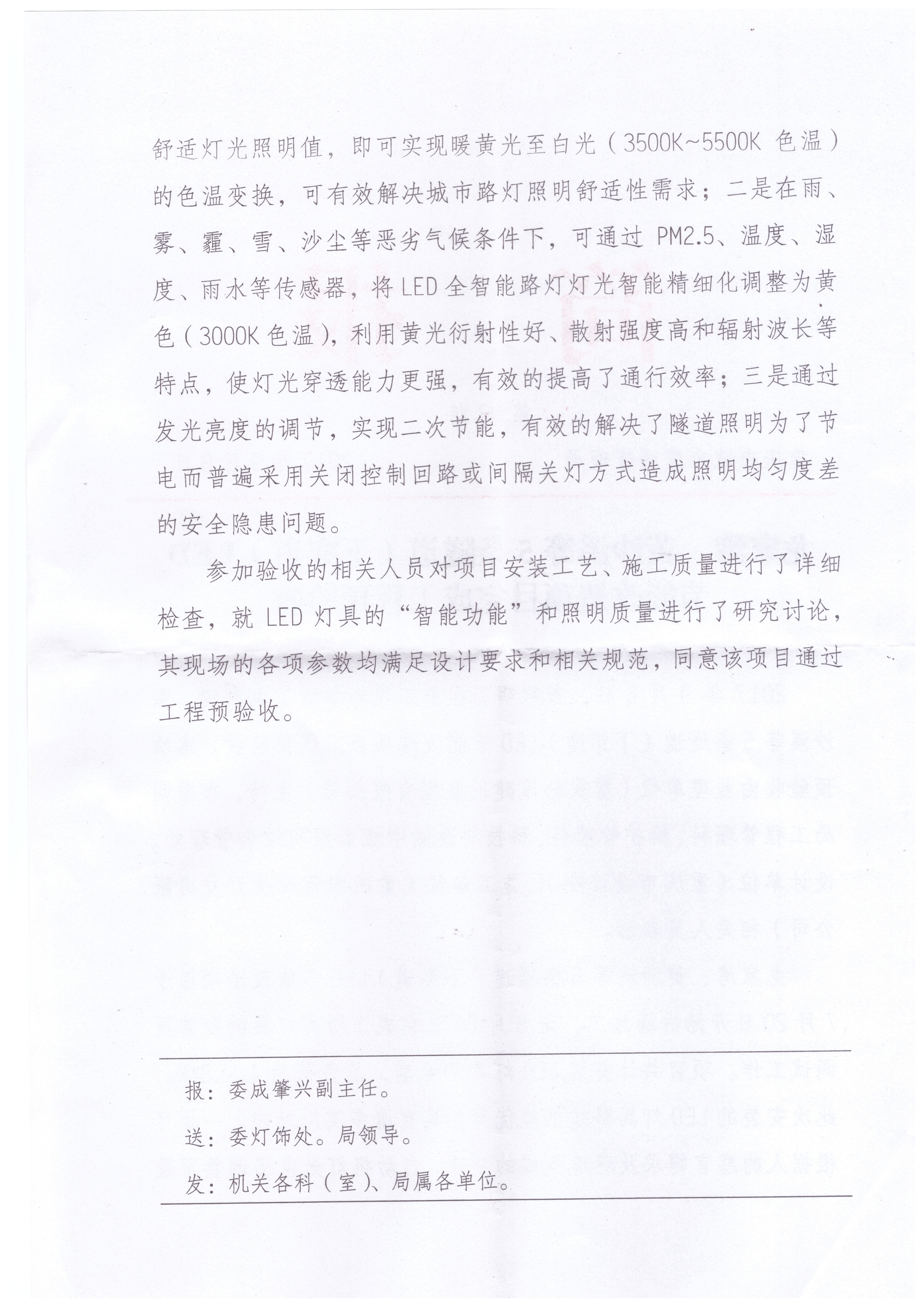 2017年7月31日,我司使用“中國創(chuàng)造”“互聯(lián)網(wǎng)+”多色溫防霧霾LED全智能路燈在重慶市龍家灣、黃沙溪、袁家崗、鵝嶺、陳家坪隧道實施科技節(jié)能改造工程已全面竣工。2017年9月6日,該項目建設(shè)單位重慶市城市照明管理局、監(jiān)理公司及設(shè)計公司對該項目進行了現(xiàn)場預(yù)驗收,參會人員對該創(chuàng)新專利產(chǎn)品作出了極高的評價。會后,重慶市城市照明管理局專門印發(fā)了《龍家灣、黃沙溪等5條隧道(下穿道)LED節(jié)能改造項目完成工程預(yù)驗收》簡報(附后),其上級主管部門重慶市城市管理委員會對其進行了新聞報道。