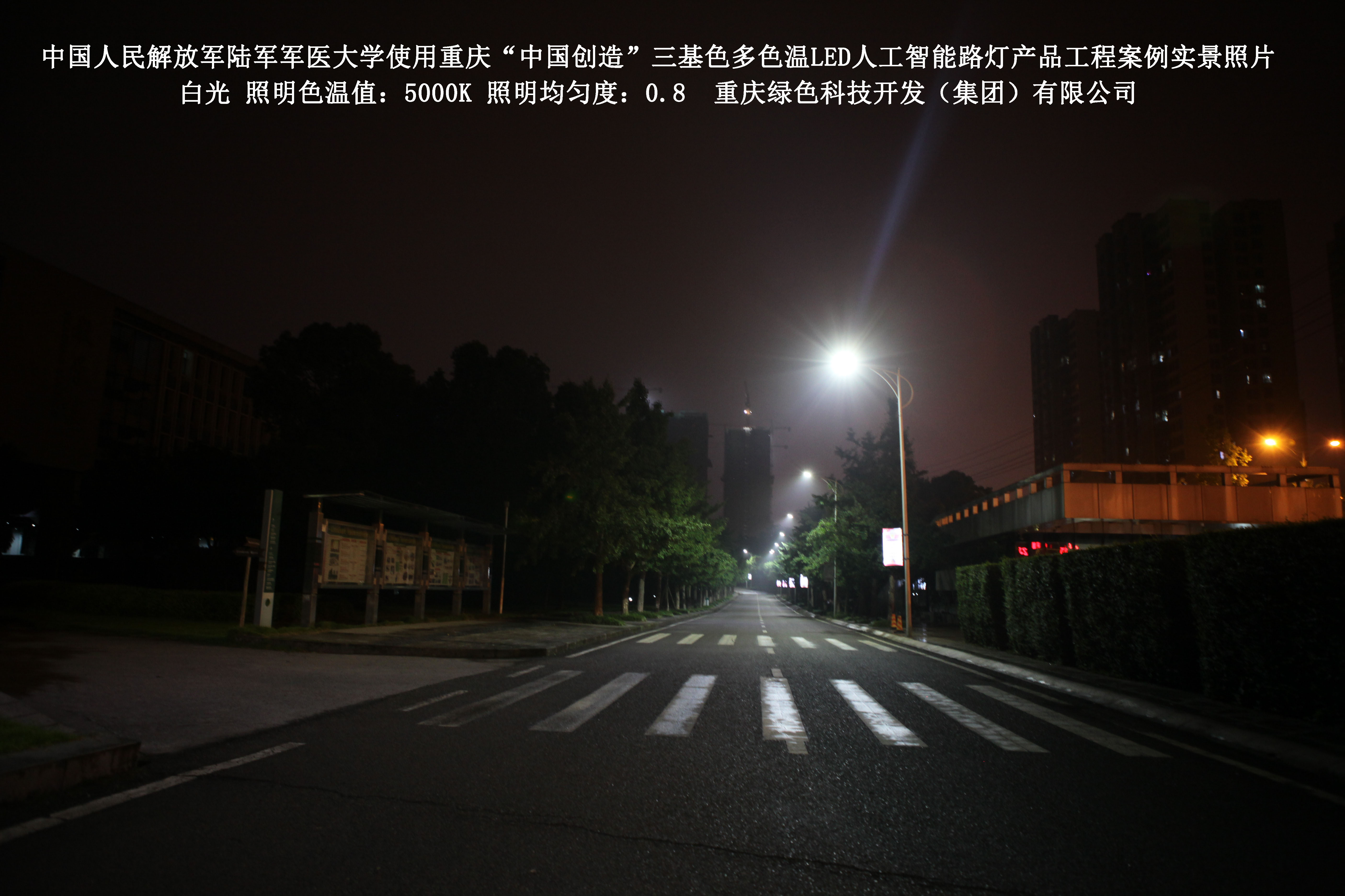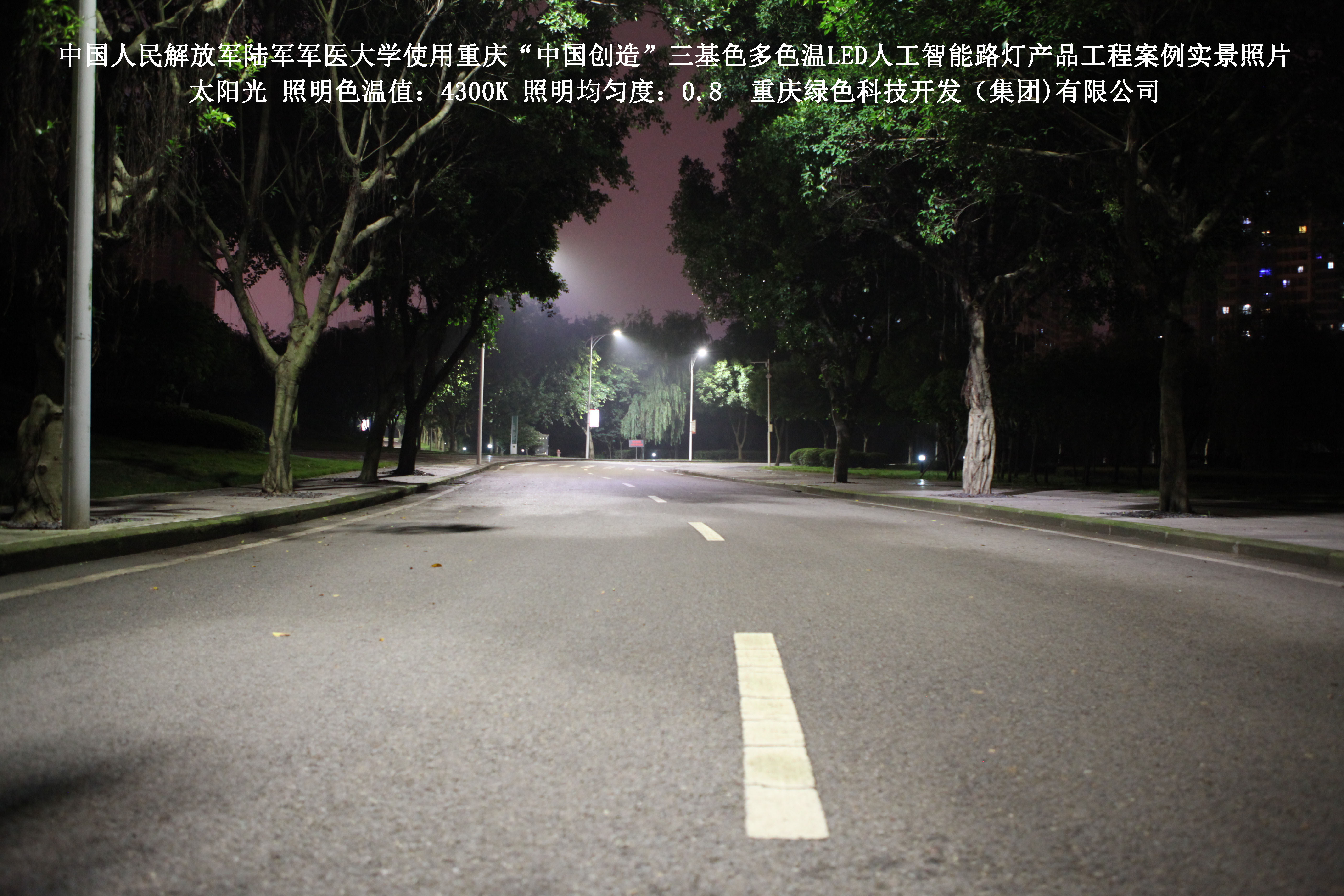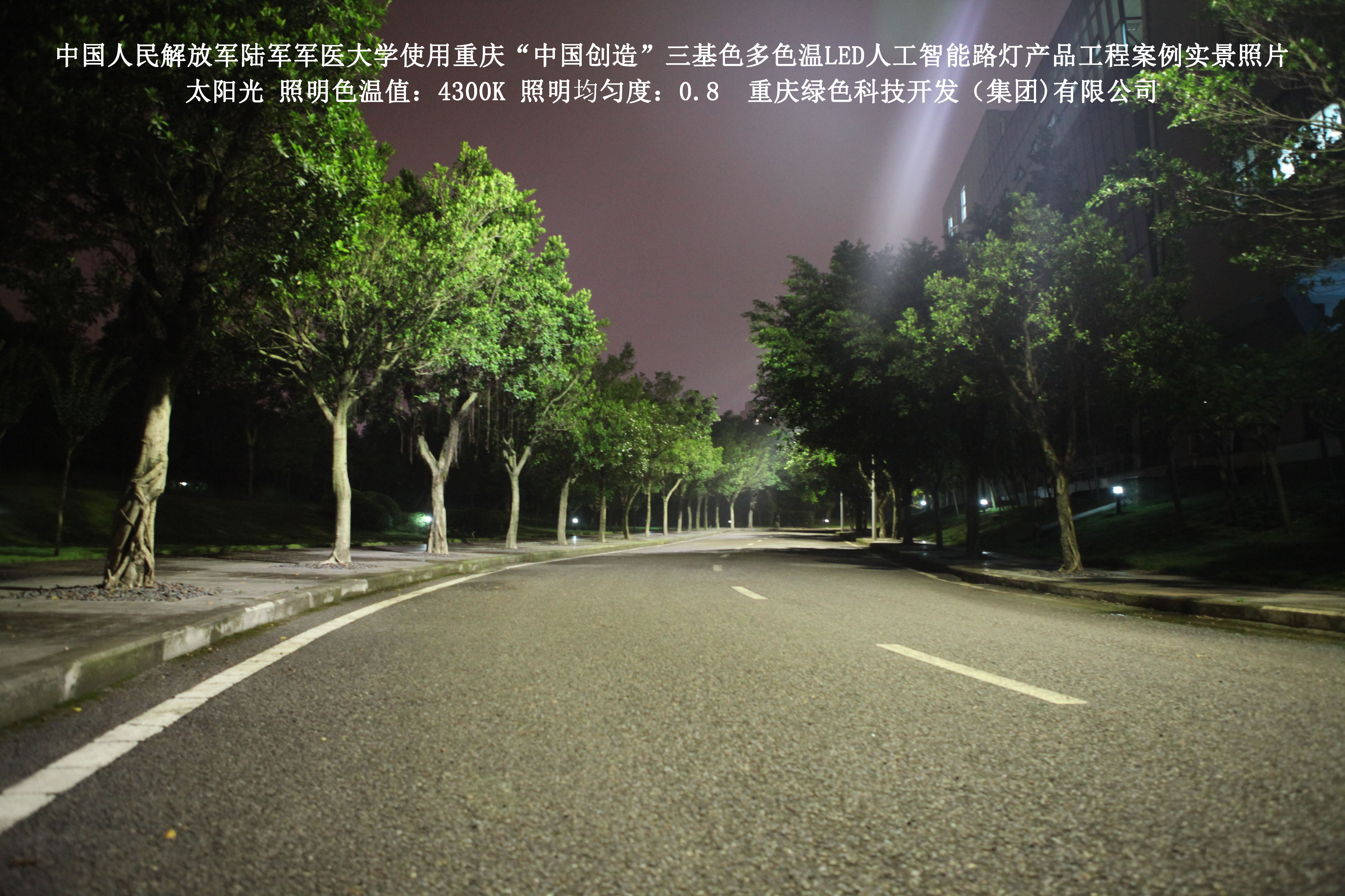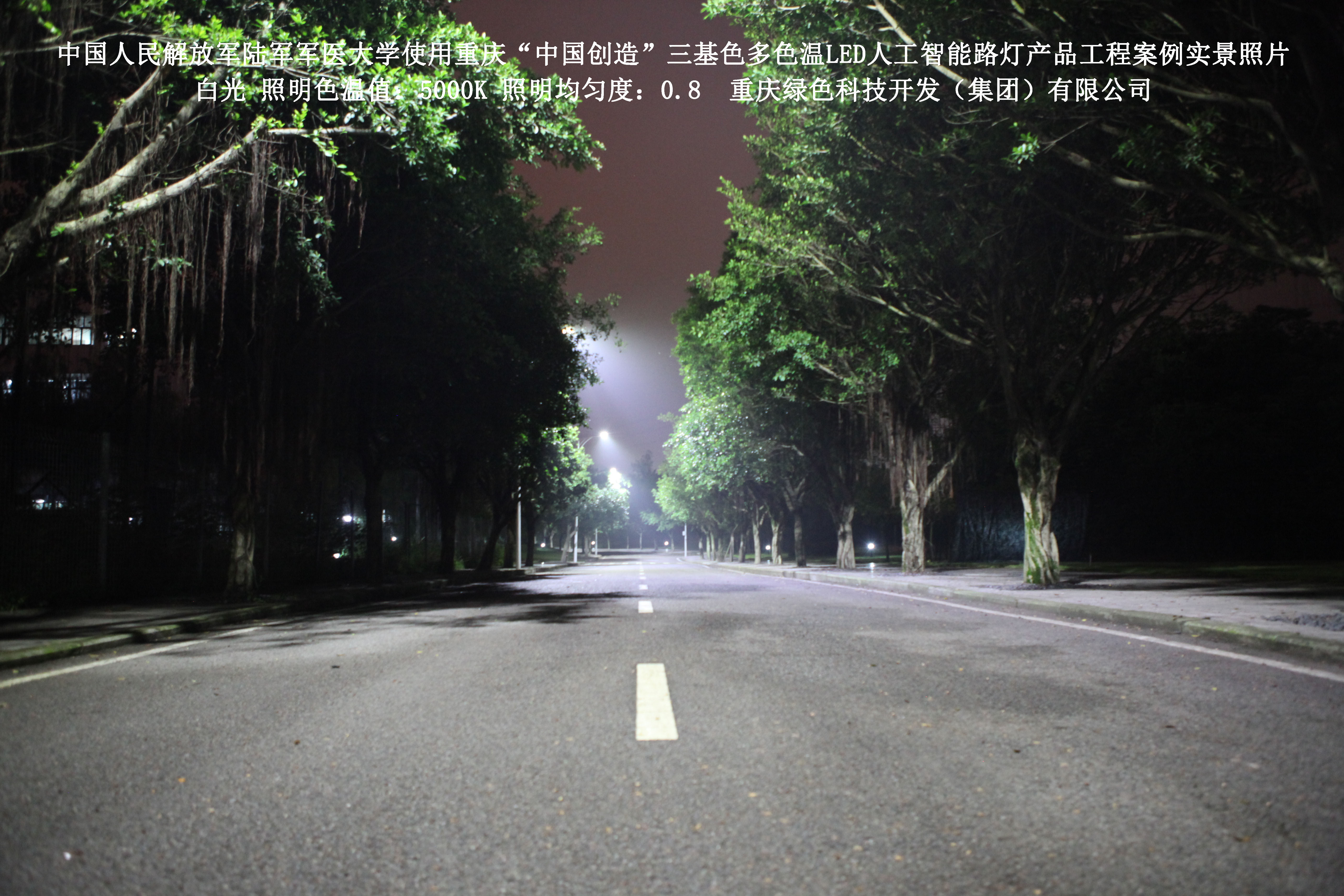 2018年4月,中國人民解放軍陸軍軍醫(yī)大學(xué)使用了我司研發(fā)制造的重慶“中國創(chuàng)造”三基色多色溫LED人工智能路燈,對(duì)沙坪壩大學(xué)城校區(qū)道路實(shí)施了綠色照明科技節(jié)能改造工程,該工程已全面竣工。工程實(shí)施后,極大地提高了照明清晰度、燈光均勻度、舒適度,實(shí)現(xiàn)城市路燈照明系統(tǒng)的智能化管理。