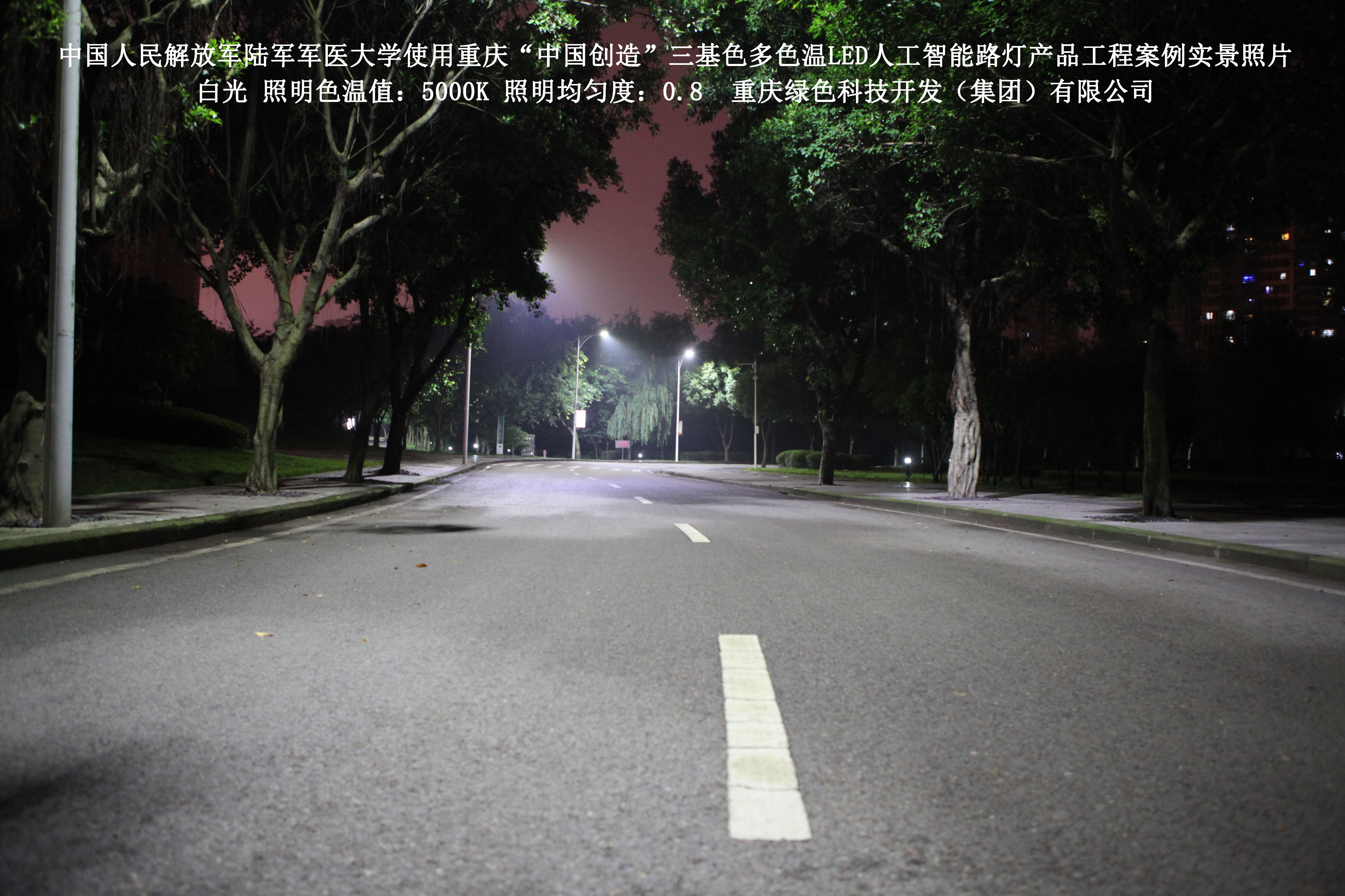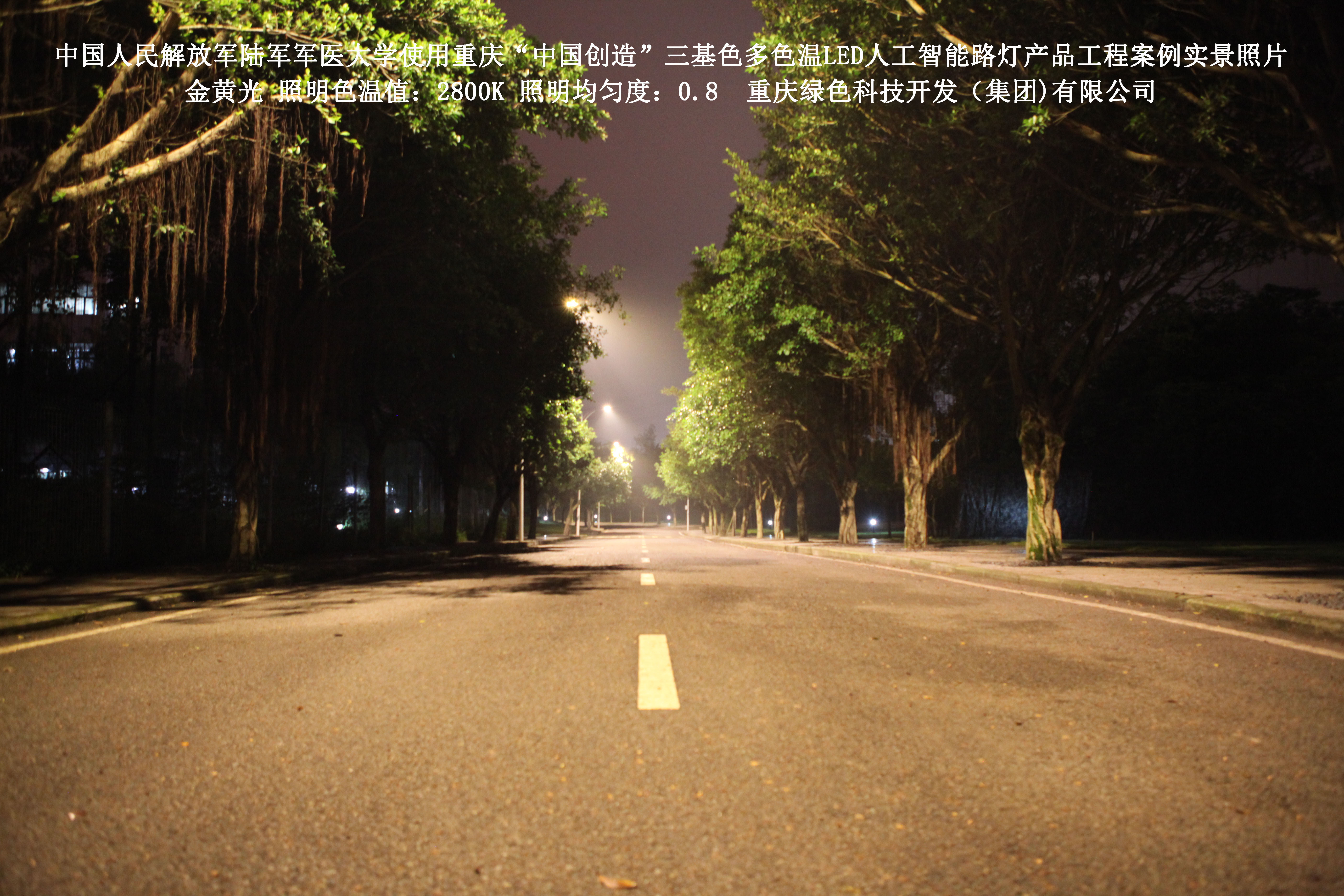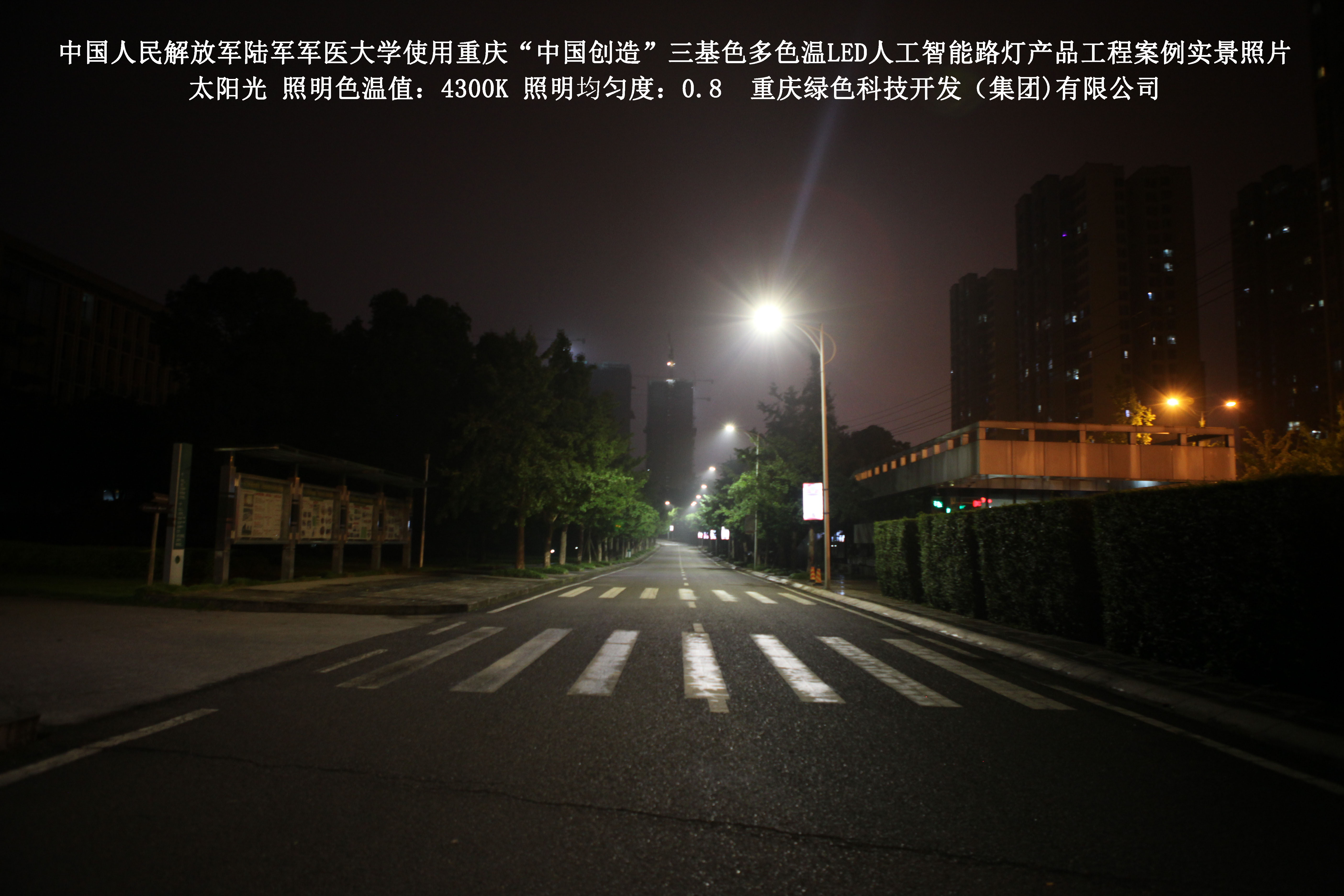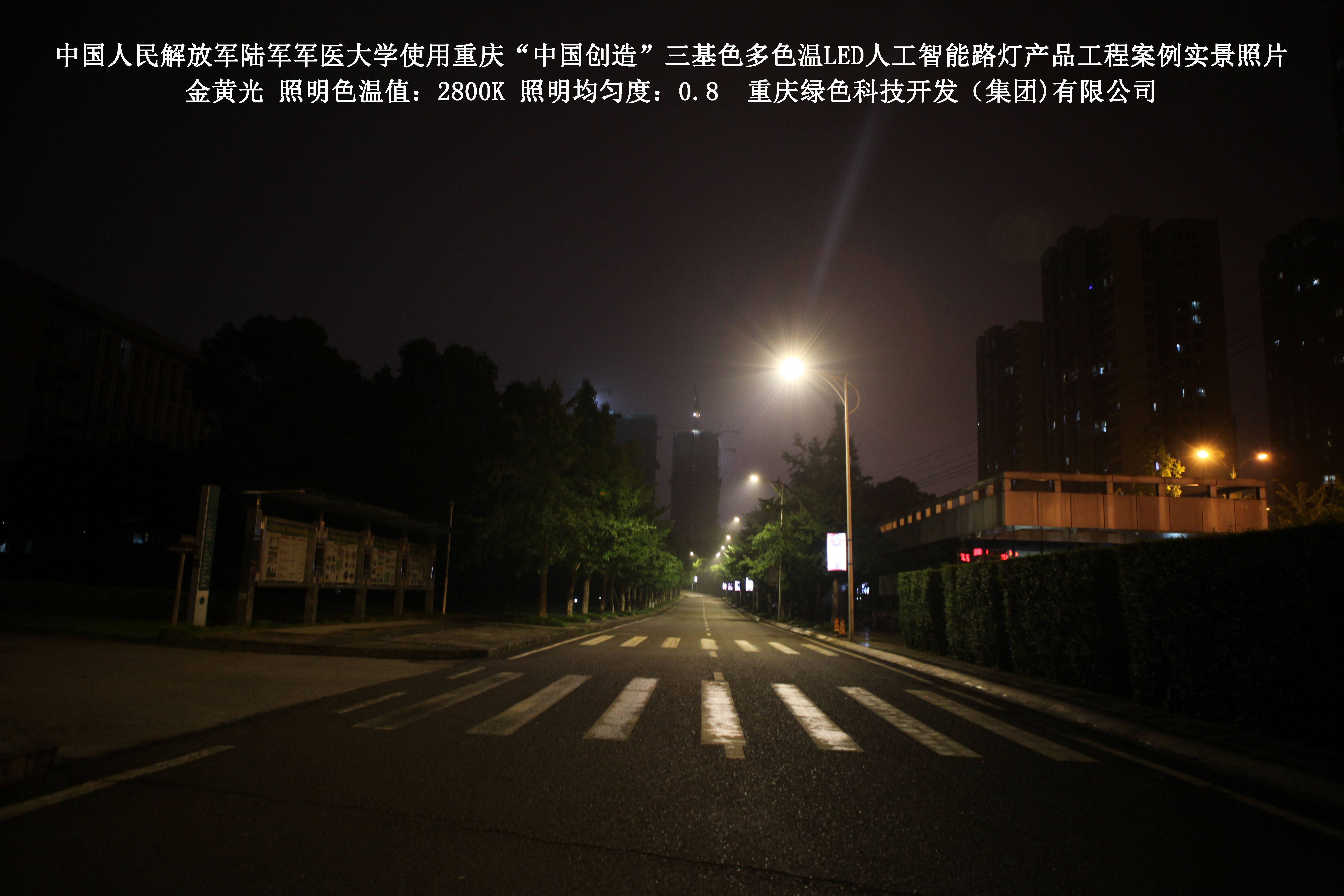 2018年4月,中國人民解放軍陸軍軍醫(yī)大學(xué)使用了我司研發(fā)制造的重慶“中國創(chuàng)造”三基色多色溫LED人工智能路燈,對(duì)沙坪壩大學(xué)城校區(qū)道路實(shí)施了綠色照明科技節(jié)能改造工程,該工程已全面竣工。工程實(shí)施后,極大地提高了照明清晰度、燈光均勻度、舒適度,實(shí)現(xiàn)城市路燈照明系統(tǒng)的智能化管理。